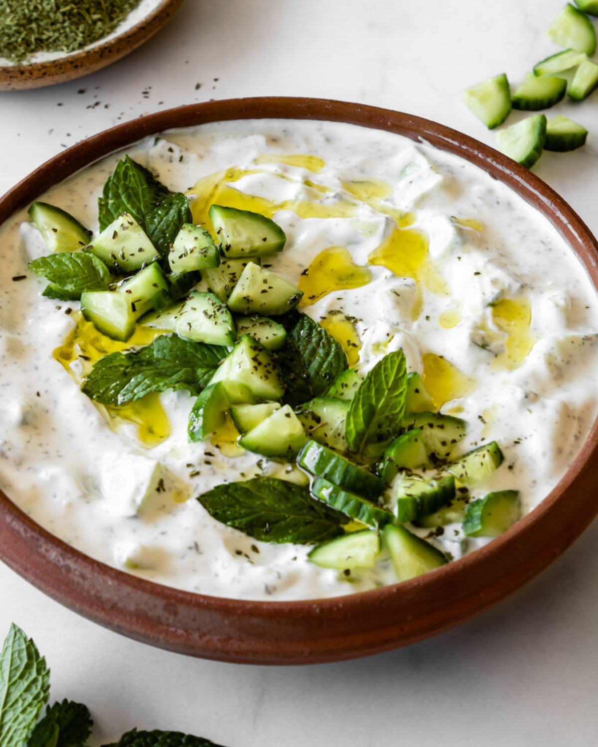 Start with grating or finely chopping cucumbers, then combine them with plain yogurt, minced garlic, and fresh mint.