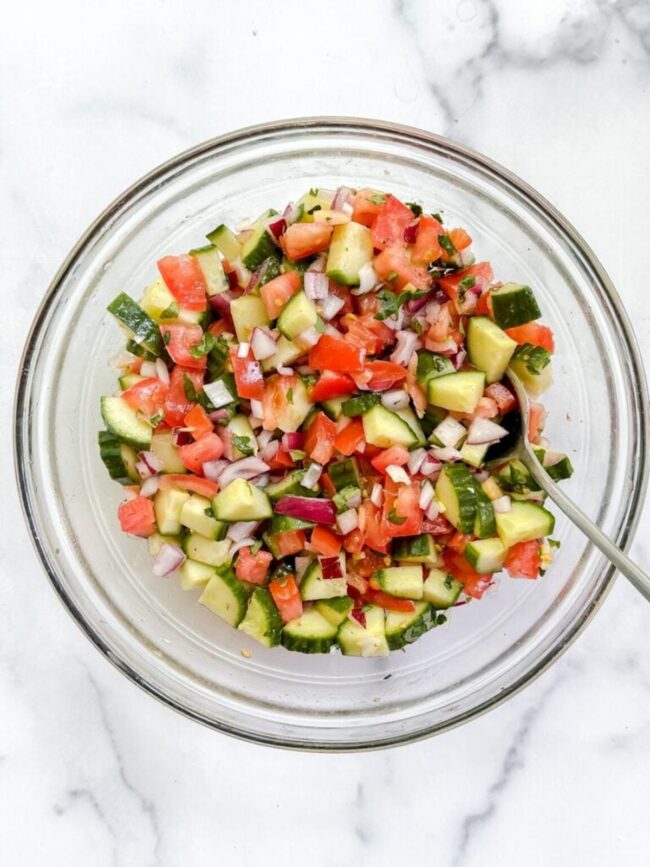 Crisp cucumbers mingle with vibrant tomatoes, fragrant herbs, and zesty lemon juice.