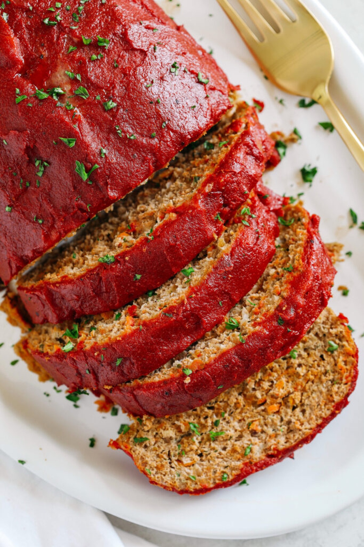 This meatloaf is baked until golden and tender, offering a healthier alternative to traditional beef meatloaf.