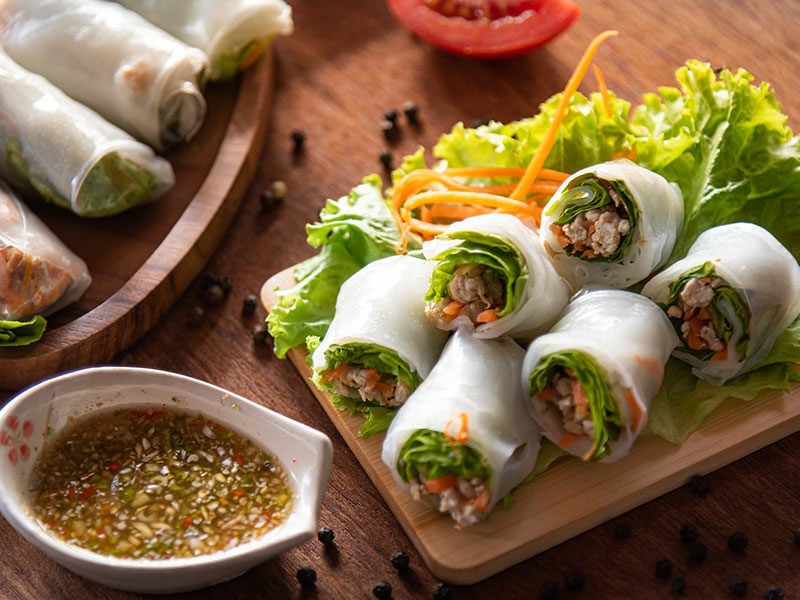 The light and refreshing taste of veggie spring rolls balance the greasy fat of deep-fried shrimp, so they go great together.